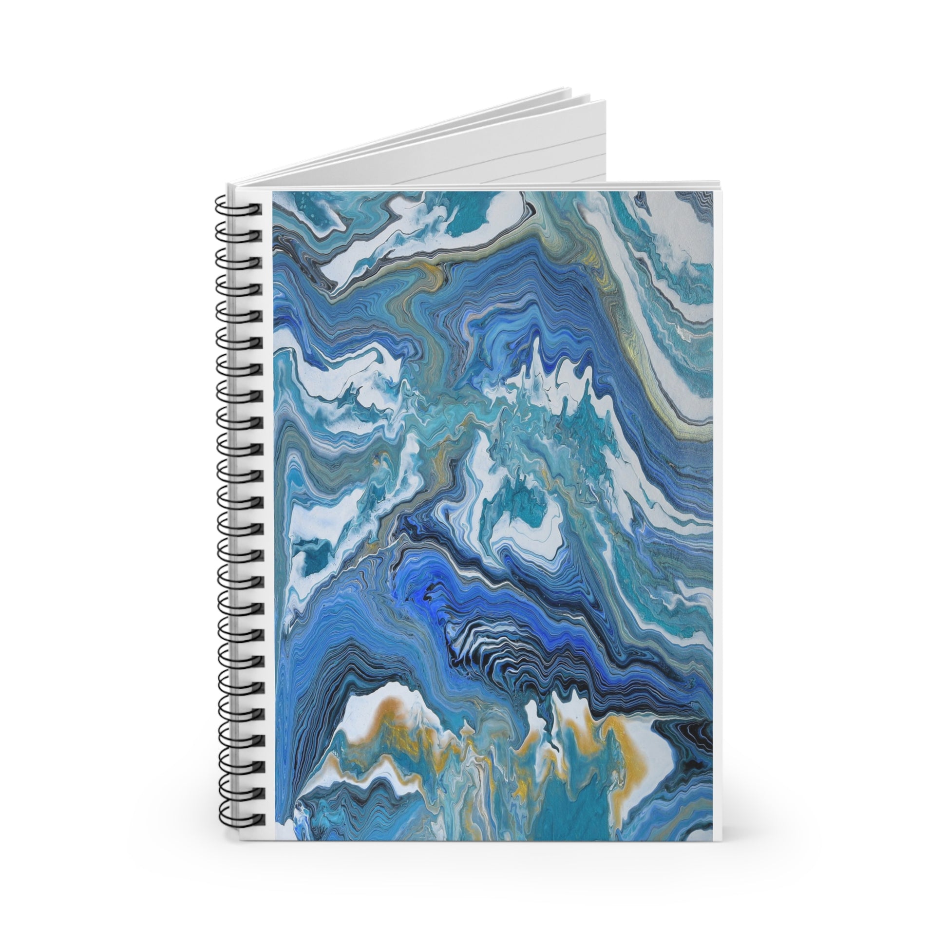 A mixed media design notebook perfect for journaling or art pages. It offers a fancy look with its metal spiral binding and includes a document pocket for added storage. The ruled line pages provide a perfect writing surface for creative individuals looking to document their thoughts and ideas.